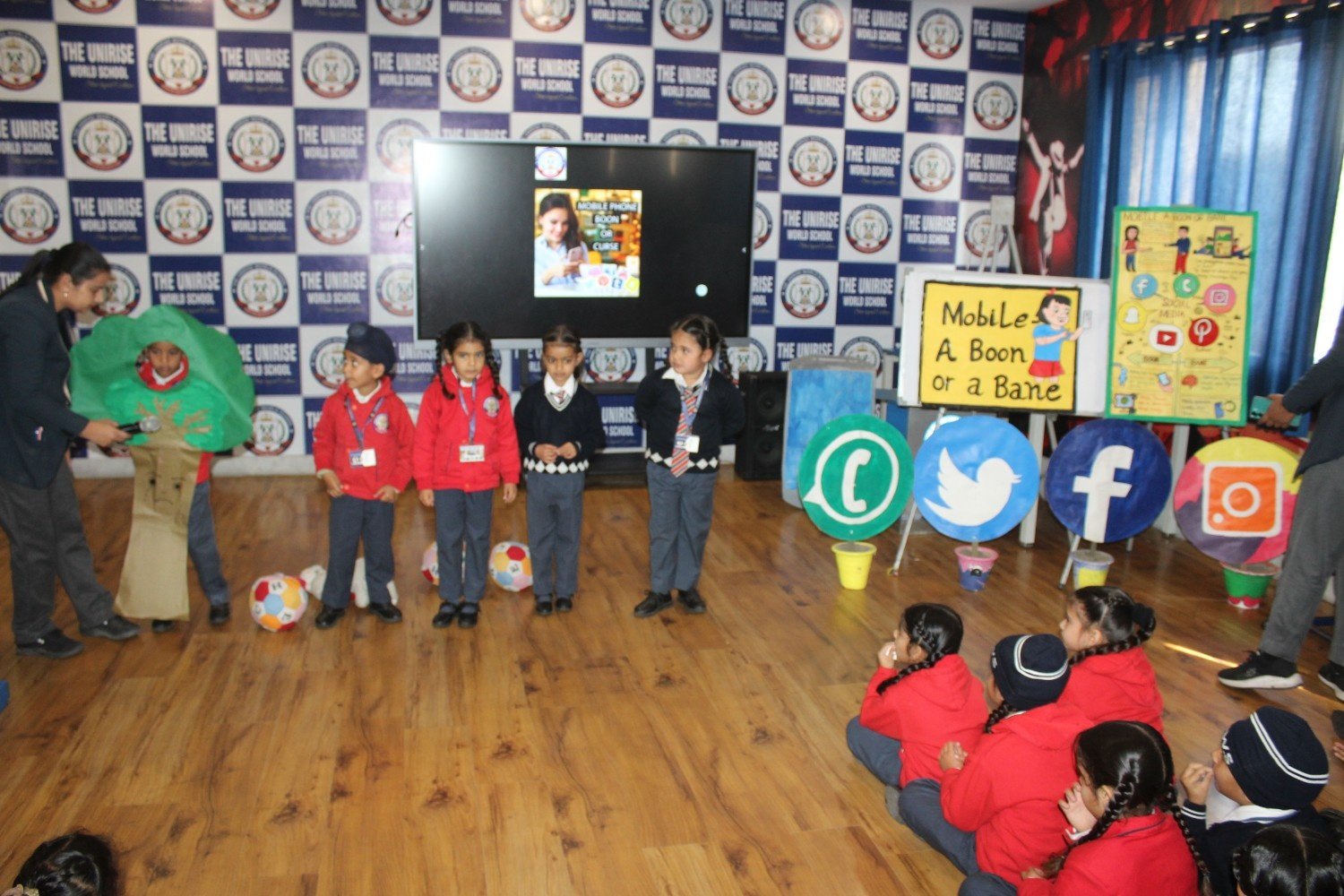 THE UNIRISE WORLD SCHOOL Kindergarten kids had a super interesting session with their teachers about mobile phones. They learned about how mobile devices can be both helpful and not-so-helpful, and how they affect our brains, eyes, and faces. The little ones even had fun discussions on whether mobile phones are a boon or a bane